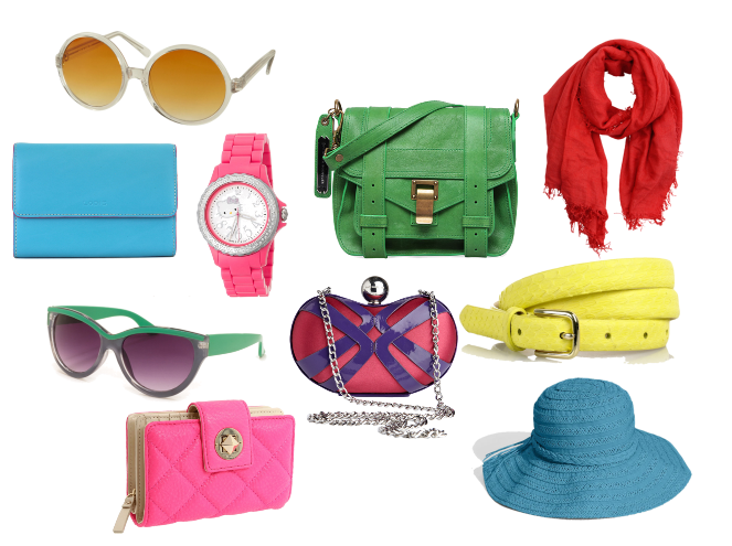 bolsas, óculos, cachecol, relógio,sintos...o que vocês quiserem, ainda mais que a moda agora ta em uma vibe bem colorida